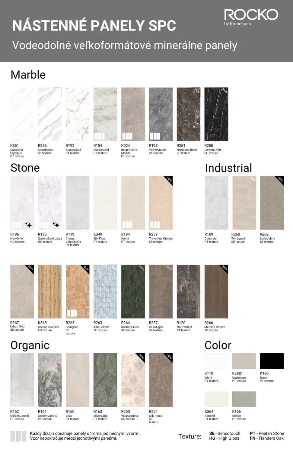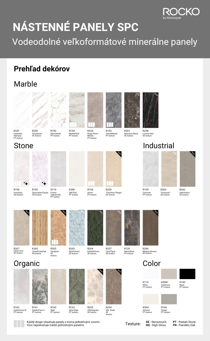 Nástenné panely SPC Rocko sú veľkoformátové panely na steny do interiéru s moderným vzhľadom a jednoduchou údržbou. Sú vyrobené z kamenného plastového kompozitu, z mramoru a recyklovateľných polymérov, pričom SPC jadro obsahuje viac ako 70 % mramoru. Výrobca ich uvádza ako plne vodeodolné, vhodné aj do vlhkých priestorov, preto sú výbornou voľbou aj do kúpeľne. Panely majú realistické dekóry inšpirované drevom, mramorom a kameňom, digitálnu tlač s UV povrchom a jednoduchú montáž na rôzne podklady.